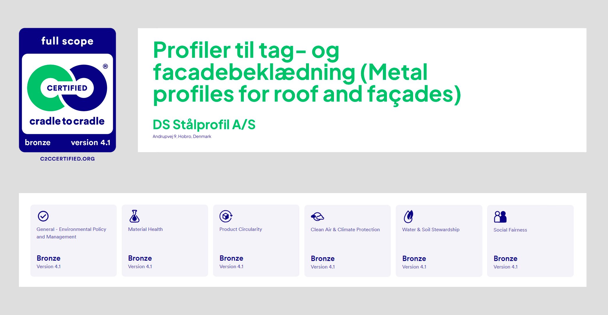 DS Stålprofil er den første danske producent af tyndpladestål, der har opnået Cradle to Cradle Certified® Bronze på hovedproduktgruppen: stålprofiler til tag- og facadebeklædning. Cradle to Cradle Certified® bygger på en uvildig 3. parts vurdering og krævende dokumentation fra både leverandører og samarbejdspartnere. Derudover er der igangsat en række interne tiltag i forhold til produktion og bæredygtighed – herunder også indkøb i et vindmølleprojekt. Blandt de certificerede produkter er GreenCoat® stålprodukter, hvor en stor del af den traditionelle fossile olie i belægningen nu er erstattet af rapsolie.
